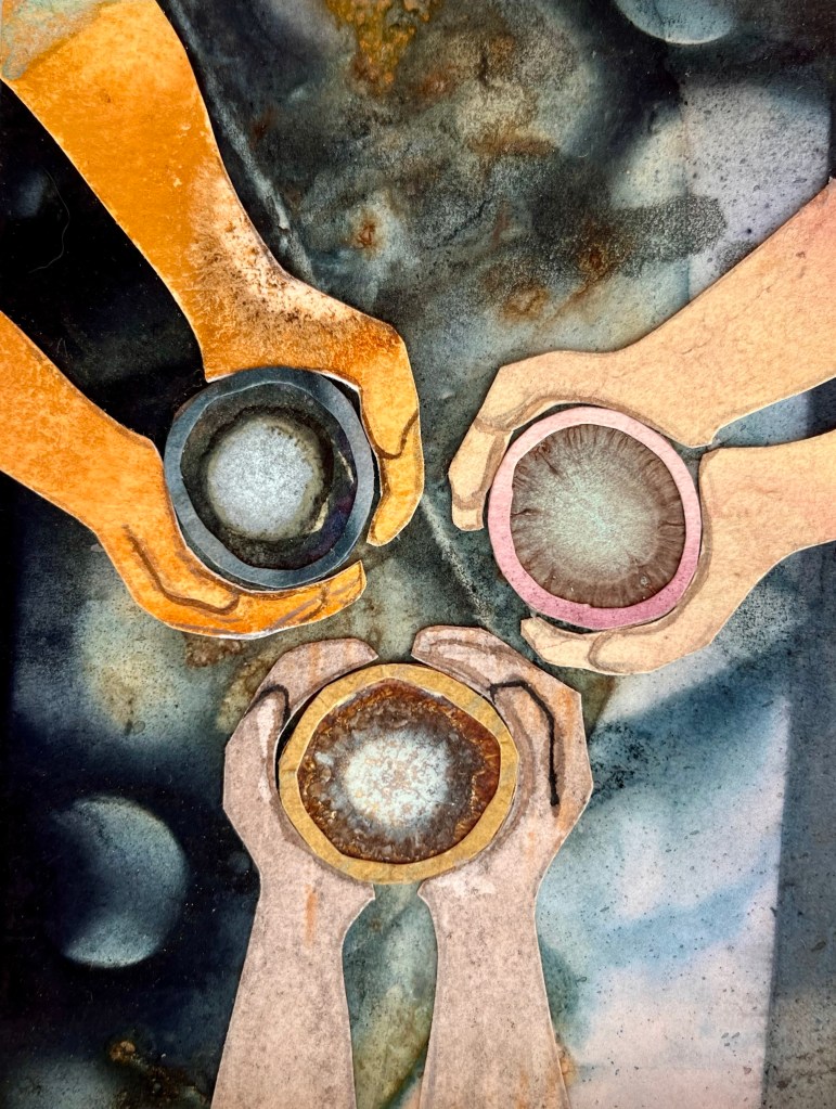 There is an easy joy and satisfaction in this card. It is if each human connected to these hands is looking at the others and gently smiling. The sparkle in their eyes says, “Isn’t it so wonderful to be here together?” The cups are full, possibly even filled with magic. The hands are being warmed by the cups. In the background we see a moon and maybe even another celestial body, as if the planets are also saying, “Isn’t it so wonderful that we’re all here together?”