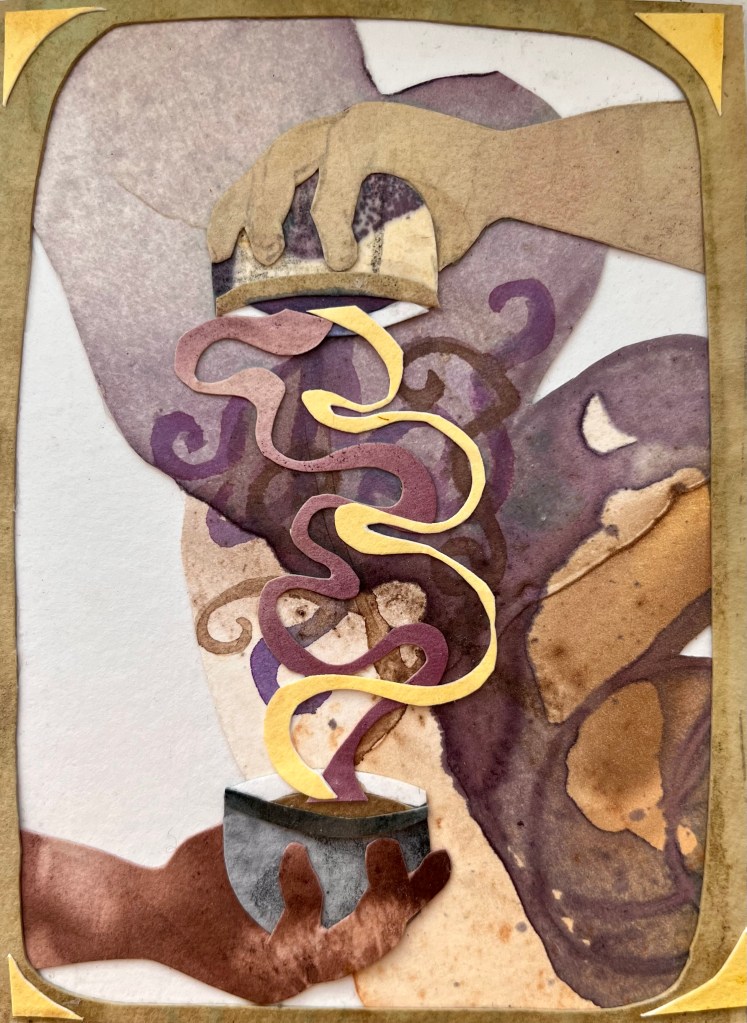 In this card, there are two hands (one above and one below), each holding a cup. The cards can easily be rotated so their positions can be changed. Neither hand is greater than or less than the other. Magical wisps and swirls of energy are rising and falling. That energy impacts the other in profound ways, sometimes in ways that words cannot describe. This image portrays two human hands, but this exchange can be between any two beings.