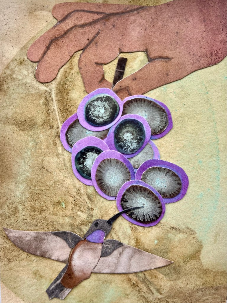 Wild grape (purple outline of grapes and throat of hummingbird): We are the bubbly magicians of the edges (of forests, our fields and our minds). We share with you our positivity, creativity and trickster capabilities.