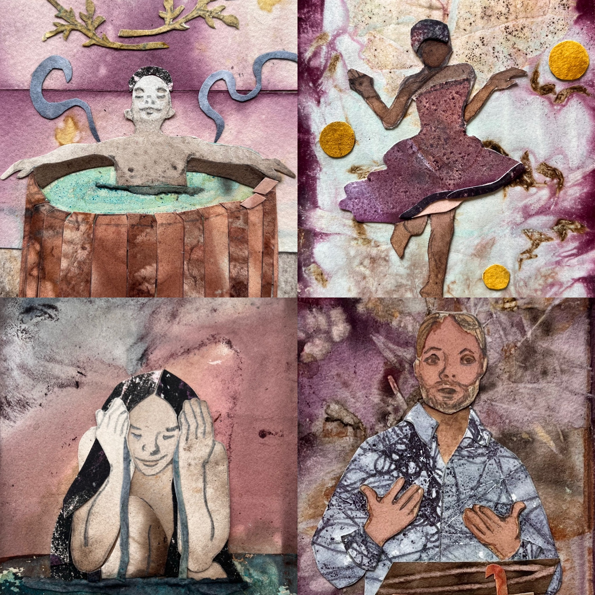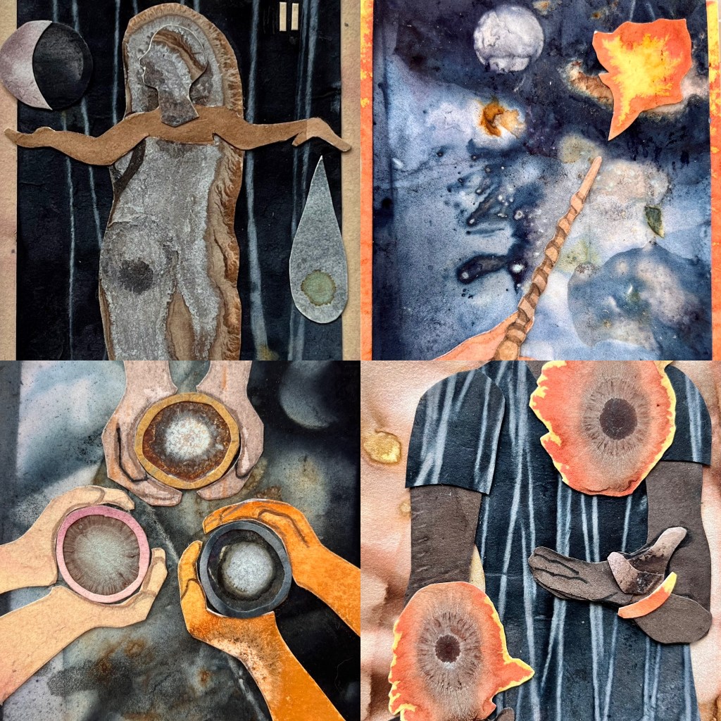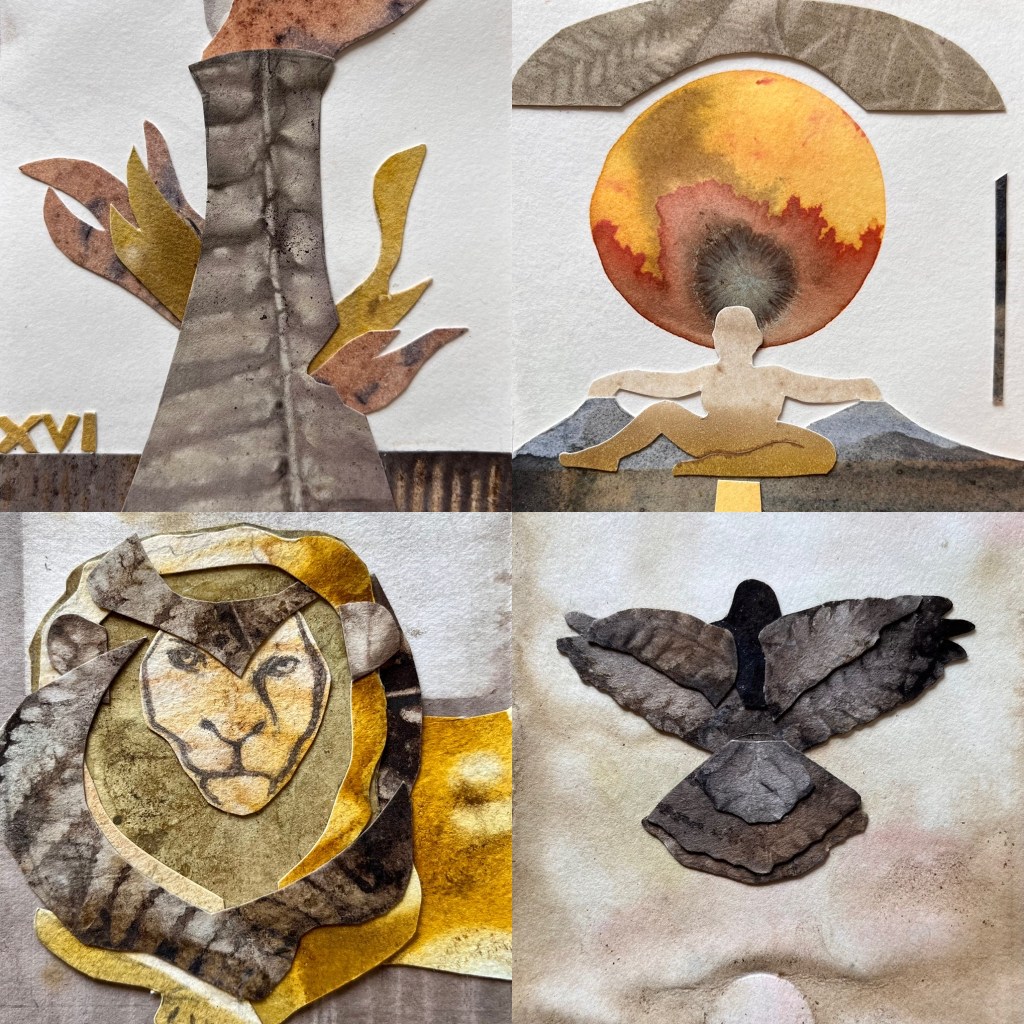 The artwork of Magical Nature Tarot was created in collaboration with dozens of plants and two metals (copper and iron). Below and scrolling above are photo montages to help you see how their colors and textures are expressed in the deck.